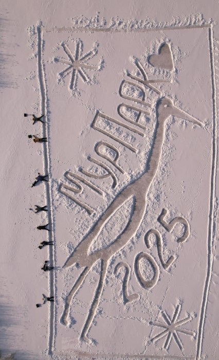Сотрудники Муравьевского парка в Приамурье поддержали традицию ледовых открыток. Они изобразили огромного журавля.