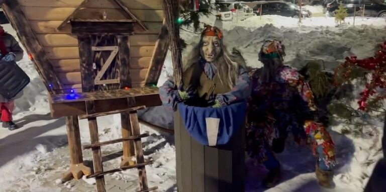 У дома поселили гномов, Деда Мороза, Снегурочку, снеговиков, героев сказки «Малахитовая шкатулка» и других персонажей. Дворовую площадку сделали царством Бабы Яги, которая живет в избушке на курьих ножках, и Кощея. Снегу, завалившему город в конце ноября, тоже нашлось применение – из него получилась большая горка.