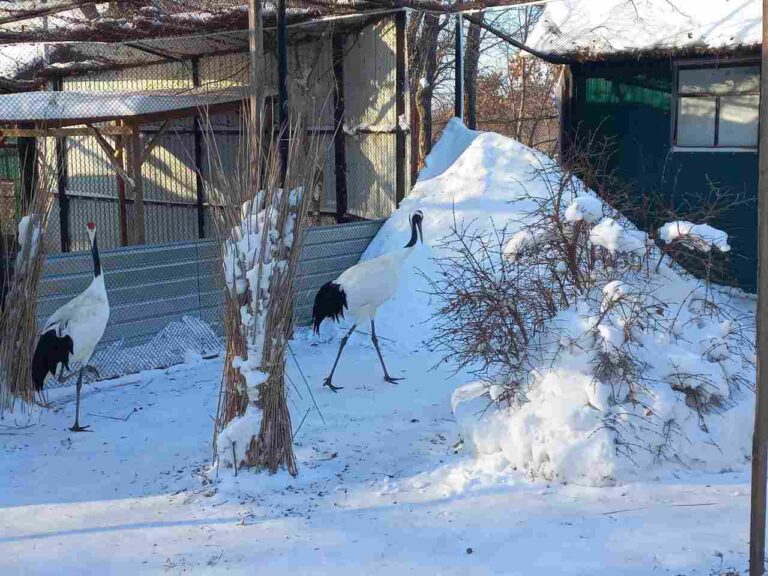 Птицы гуляют, пока на улице ещё не сильно холодно. При дневной температуре до -14 градусов журавли ходят по расчищенным от снега вольерам и исследуют свои владения.