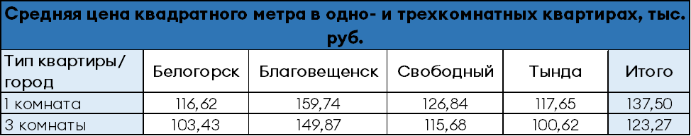 Самые дешёвые «однушки» в Тынде (117 тысяч 650 рублей за квадратный метр), а самые дорогие – в Благовещенске. В областном центре за «квадрат» в среднем придется отдать 159,74 тысячи рублей, хотя в отдельных случаях цена перевалила и за 220 тысяч рублей.