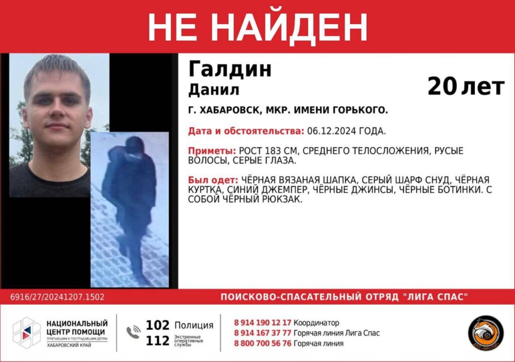 Больше месяца продолжаются поиски 20-летнего жителя Хабаровска Данила Галдина. Его местонахождение неизвестно с 6 декабря 2024 года. Мужчина может находиться в Амурской области. Об этом сообщили в добровольческом поисково-спасательном отряде «Лига Спас».