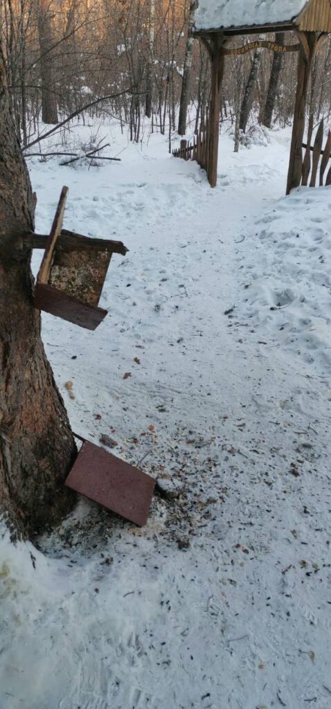 Также вандалы не прошли мимо кормушек для птиц. Сейчас кормушки полностью разрушены и не пригодны для использования.