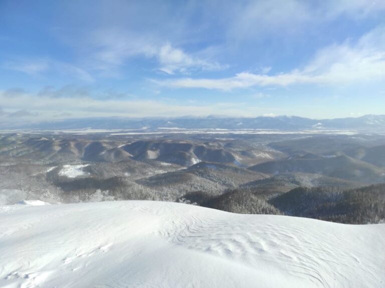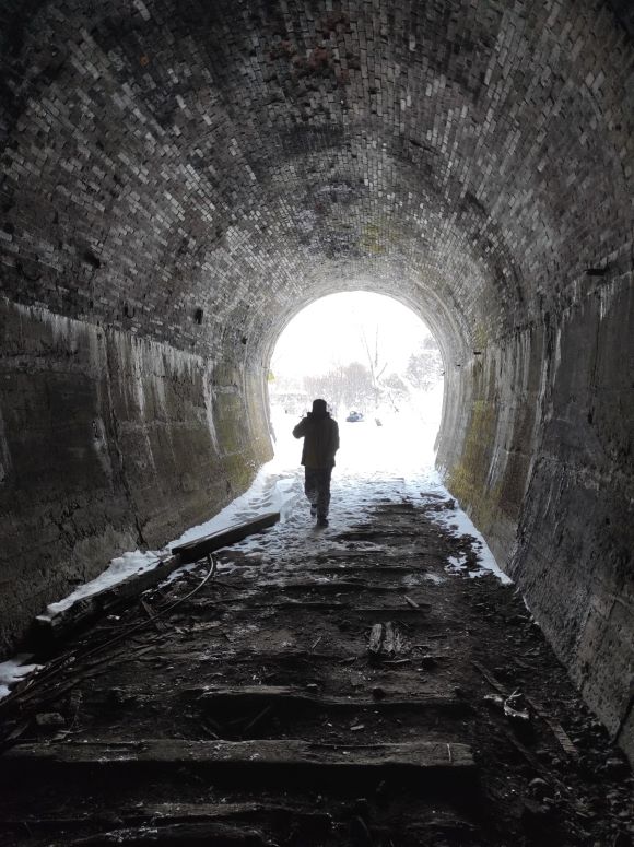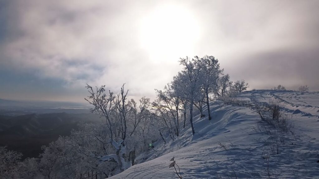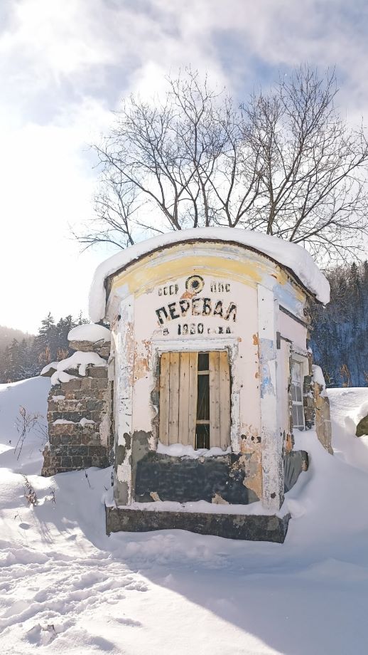 На снегоходе мы по Мицульскому хребту добрались до вершины горы Почтовая выше облаков, которые проносились под ногами с невероятной скоростью. Оттуда нам открылись очень красивые виды на Сахалин. Дорога туда и обратно пролегала вдоль обрыва, и потому было немного жутковато ехать на снегоходе. Посещали мысли в духе «а вдруг улечу в пропасть». На снегоходе мы добрались до железной дороги, построенной японцами. Увидели железнодорожный туннель – он обвалился и находится в аварийном состоянии.