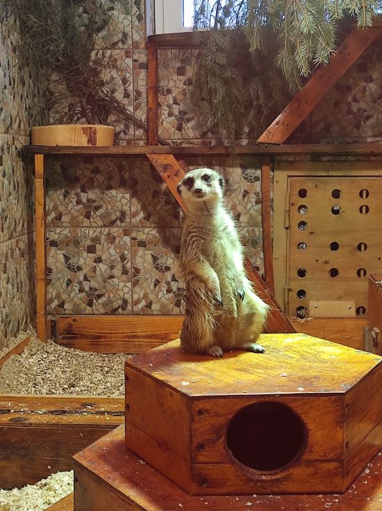 Там же, в зоопарке, есть множество открытых вольеров для птиц, хищников, копытных и мелких грызунов. Водоем в зимнее время не работает. Но и внутри в зоопарке есть на что посмотреть. Мы потратили на это часа три. Посетили экспозицию «Аквариумы» и затем «Экзотариум» со змеями, хамелеонами, пауками, тараканами, птицами и лягушками. Особенно интересно было находить хамелеонов, потому что они маскируются, рассматривать змей с ярким нарядным окрасом и лягушек. Самая смешная лягушка – моховая. Она действительно похожа на кусок зеленого мха. Есть даже ядовитая и самая крупная жаба – ага. Еще нас там очень позабавил сурикат: встал столбиком и стоял минут 20, смотрел на всех.