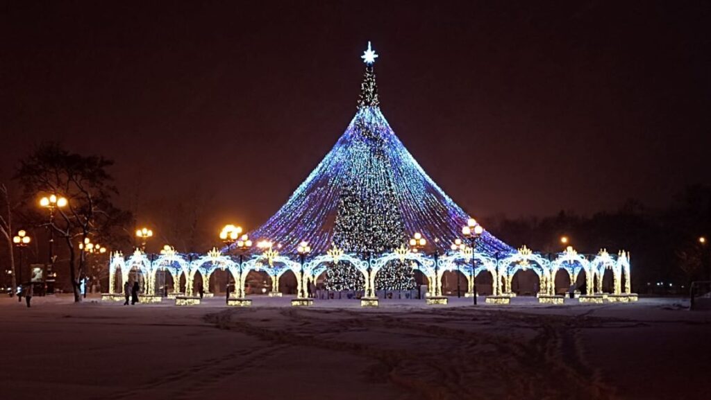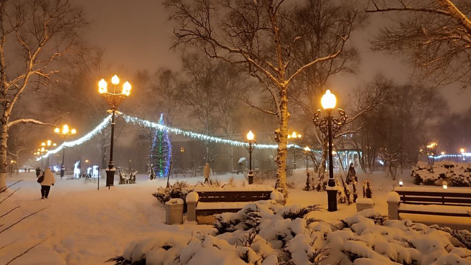 По приезде в Южно-Сахалинск мы сразу же отправились в Сахалинский областной краеведческий музей и гулять по городу. Там уже царило предновогоднее настроение. Вечером Южно-Сахалинск выглядел очень нарядным и красочным.