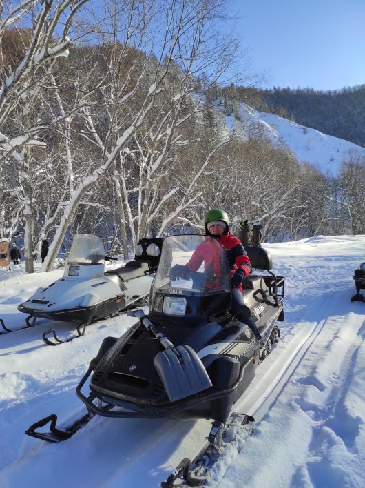 Очень экстремально прошла наша экскурсия на снегоходах. День выдался удачный, солнечный. И нам для защиты глаз от солнца и ветра выдали специальные очки, а для безопасности – шлемы. Снегоходами мы управляли сами, это совсем несложно. Нажимаешь на рычаг – он едет, отпускаешь – останавливается. Даже я решилась поуправлять им на безопасном участке. Выяснилось, что я люблю экстремальное вождение, и муж позади меня чуть не поседел от страха.
