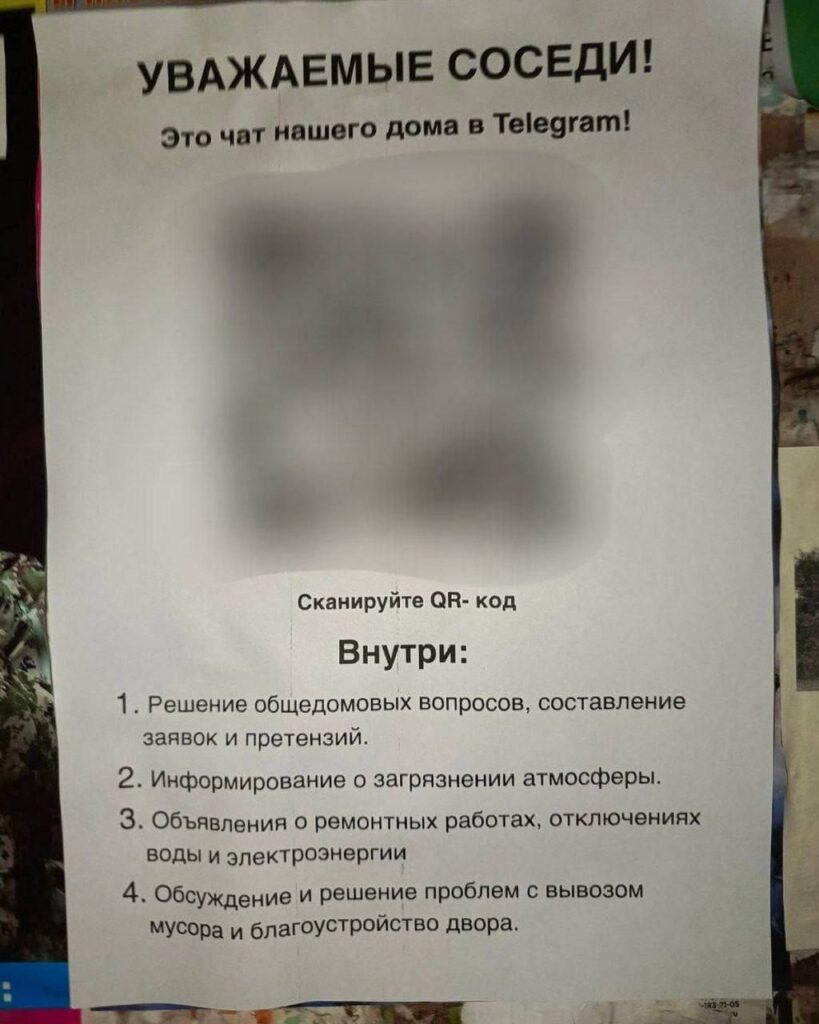 «Мошенники начали взламывать телеграм-аккаунты россиян при помощи «домовых чатов». Один QR-код – и вы теряете ВСЕ свои данные. Схема такая: в подъезд вешают непримечательное объявление о новом чате для всех соседей. К нему прикреплён QR-код, по которому НЕЛЬЗЯ ПЕРЕХОДИТЬ. Распространите».