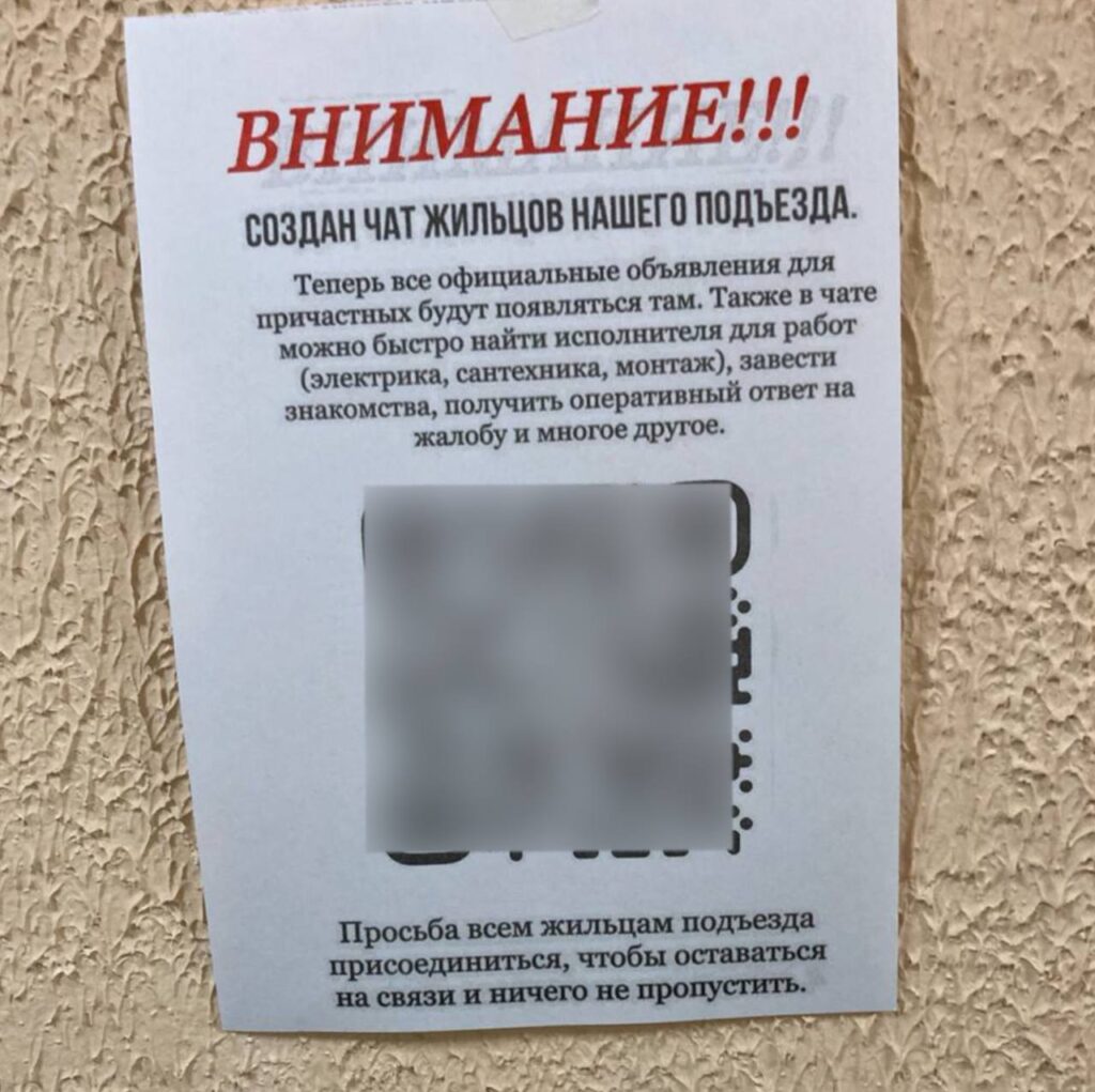 По общедомовым чатам благовещенцы массово рассылают предупреждения о новой схеме мошенничества. На этот раз аферисты расклеивают по подъездам объявления с QR-кодом, якобы ведущим на домовой чат жильцов.