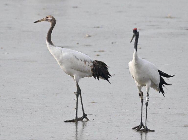 «Китайские коллеги прислали свежие фотографии семьи Снежинки с заповедника Ляохэкоу. Вместе с десятками других японских журавлей наша семейка бродит по покрытым льдом рисовым чекам и берегам реки Ляохэ рядом с журавлиным питомником», – написал он.