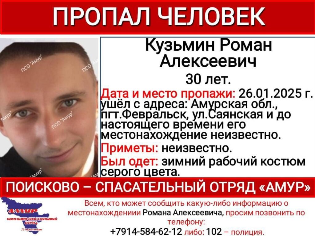 В Амурской области пропал 30-летний Роман Алексеевич Кузьмин. Об этом сообщил поисково-спасательный отряд «Амур».