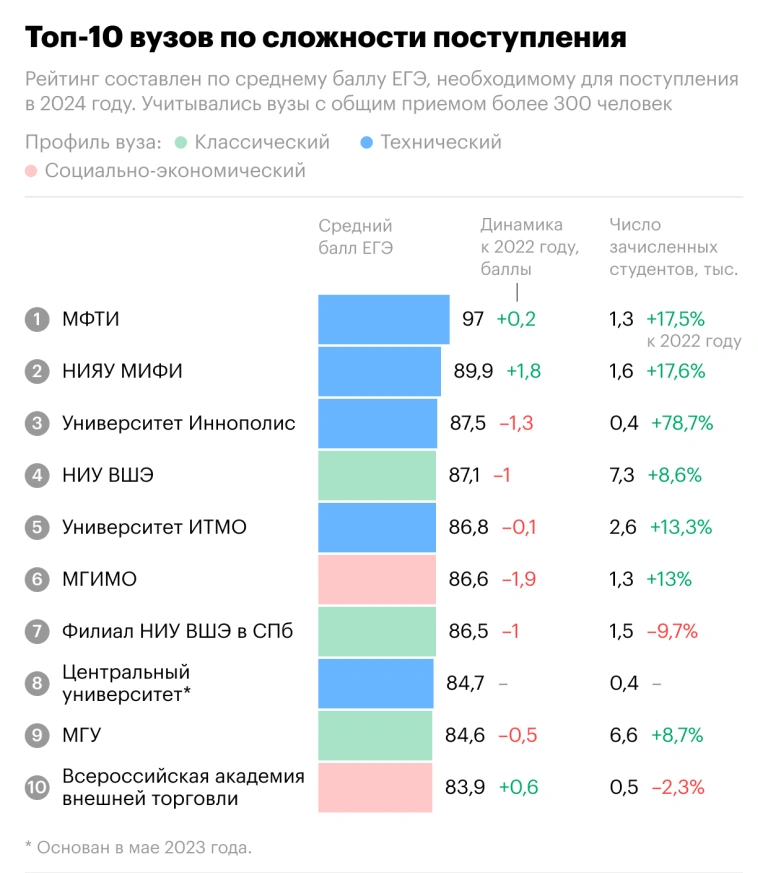 МФТИ стал самым сложным для поступления вузом России. Московский физико-технический институт – ведущий технический вуз страны, который входит в престижные рейтинги лучших университетов мира. Из-за высокого уровня популярности среди абитуриентов средний балл ЕГЭ, необходимый для поступления на бюджетное отделение в институт, составил в 2024 году 97.