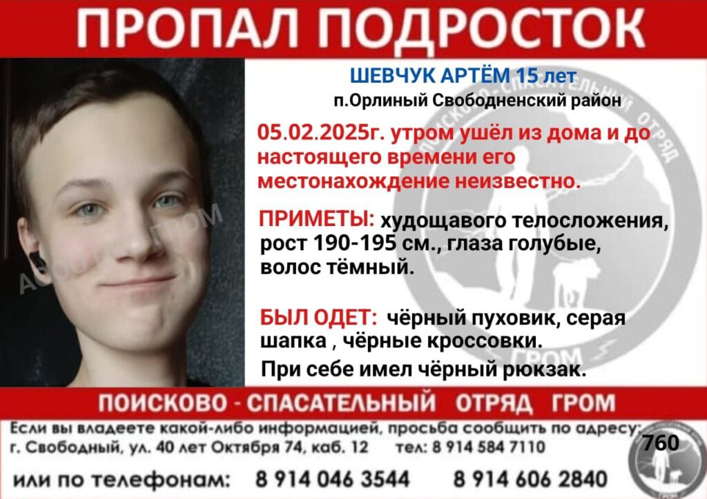 В посёлке Орлиный Свободненского района пропал 15-летний Артём Шевчук. О розыске подростка сообщил поисково-спасательный отряд «Гром».