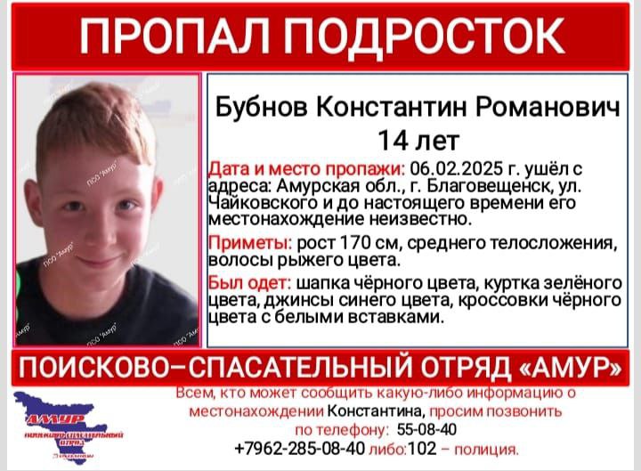 В областном центре пропал 14-летний Константин Бубнов. Об этом сообщили в поисково-спасательном отряде «Амур».