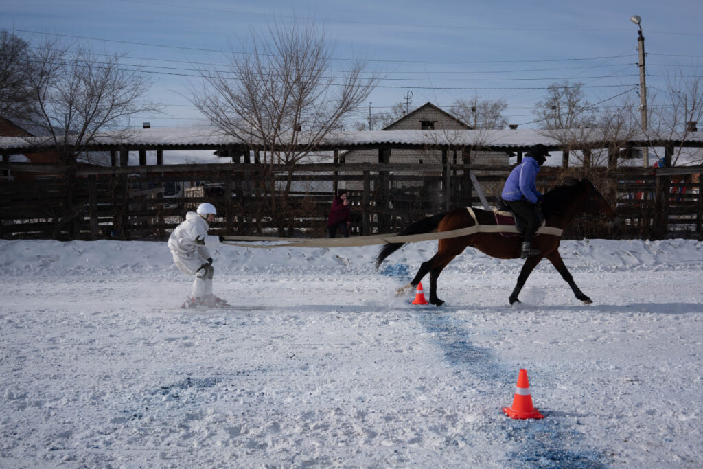 В каждом заезде спортсмены работали парами. Всадники на лошадях проходили дистанцию в 300 метров на полном галопе, а позади них лыжники проходили змейкой все конусы по трассе маршрута и прыгали с трамплина.