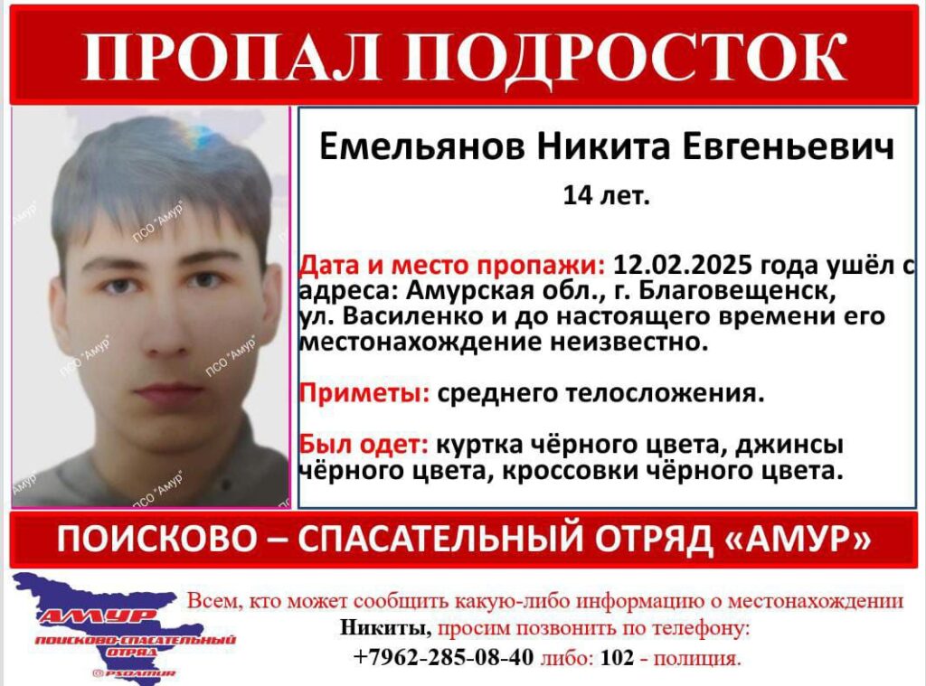 В Благовещенске ищут 14-летнего Никиту Евгеньевича Емельянова. Об этом сообщил поисково-спасательный отряд «Амур».
