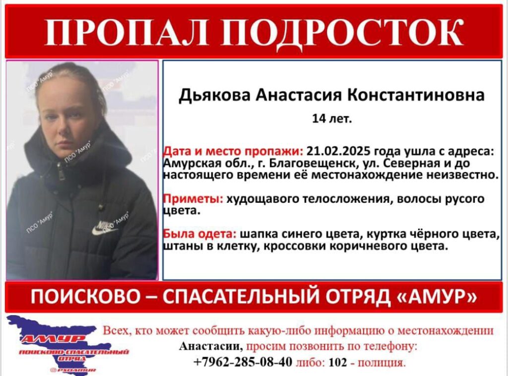 В Благовещенске разыскивают 14-летнюю Анастасию Константиновну Дьякову. Девочка ушла с адреса на улице Северной 21 февраля и перестала выходить на связь. О пропаже подростка сообщил поисково-спасательный отряд «Амур».