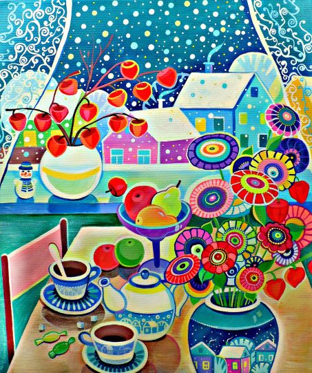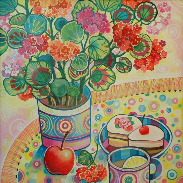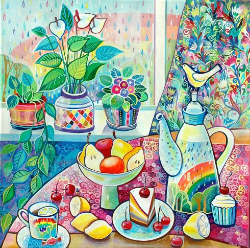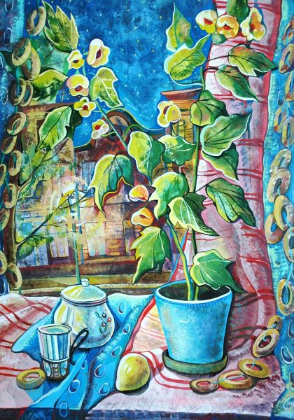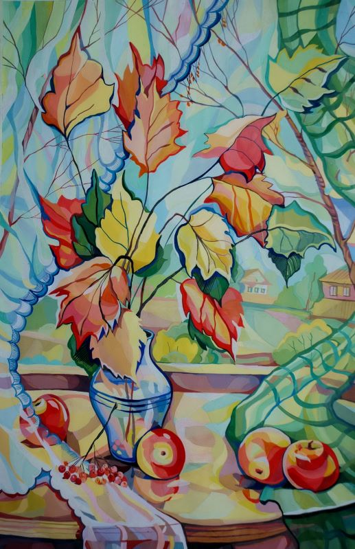 Я начинала с декоративных натюрмортов. Что-то писала с натуры, что-то придумывала. И выполняла работы гуашью, а для яркости добавляла где-то качественную акварель. Этот стиль был похож на витраж: предметы разделялись на фрагменты и плоскости разных оттенков благодаря форме и разным цветам, присутствовали разной толщины и пластики контуры.