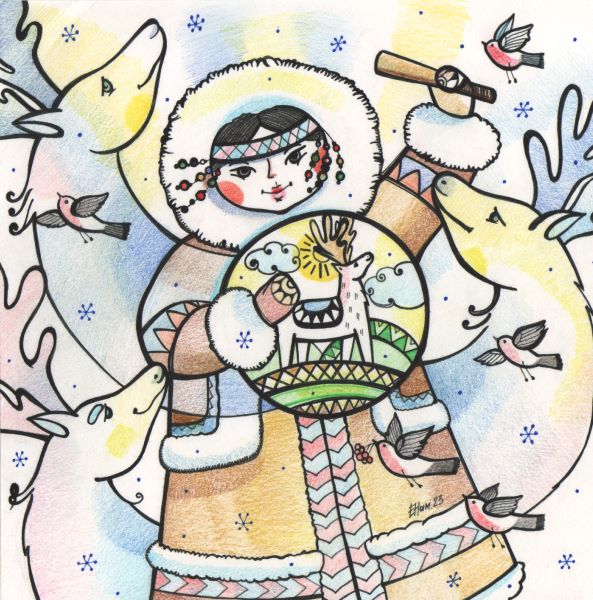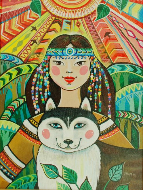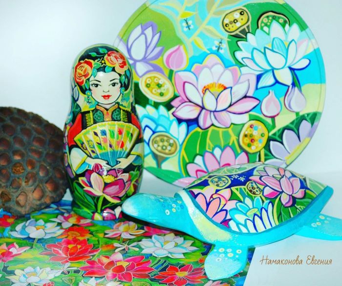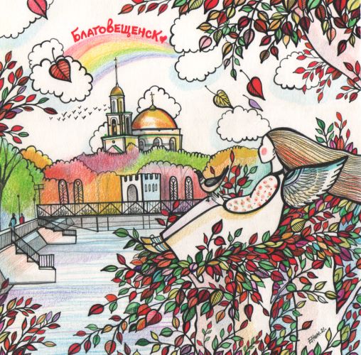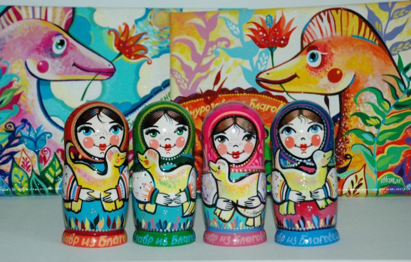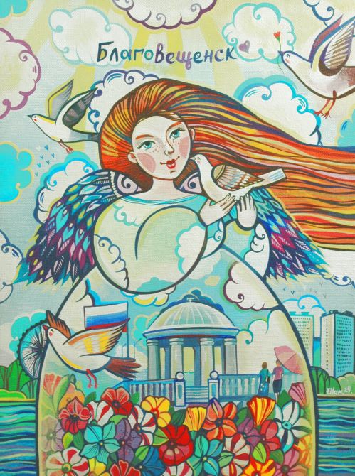 — Безусловно, русская тематика. Наша культура так богата и привлекательна, что обойти её не могу. Это и региональный компонент, в том числе культура коренных жителей Амурской области – в живописи и росписи я изображаю, помимо всего прочего, эвенков. Конечно, тут и амурские «изюминки»: амурозавры, космодром Восточный, достопримечательности Благовещенска, местные растения и животные. Все эти мотивы я использую, когда пишу картины, что-то расписываю, так как эта тема людям действительно интересна и потому очень актуальна. Ещё одна очень хорошая, на мой взгляд, тема – это мои «Ангельские истории». Во время пандемии на Рождество четыре года назад появился мой первый графический ангел. И вот их уже более 70 штук. Причём кто-то в этих образах видит ангелов, а кто-то – фей. Большинство нарисованных крылатых уже от меня улетели и живут в разных уголках России и Китая. И, кроме перечисленного, я делаю ещё туристические сувениры, ведь мы находимся на границе с Китаем, а жителям этой страны наша культура очень интересна.
