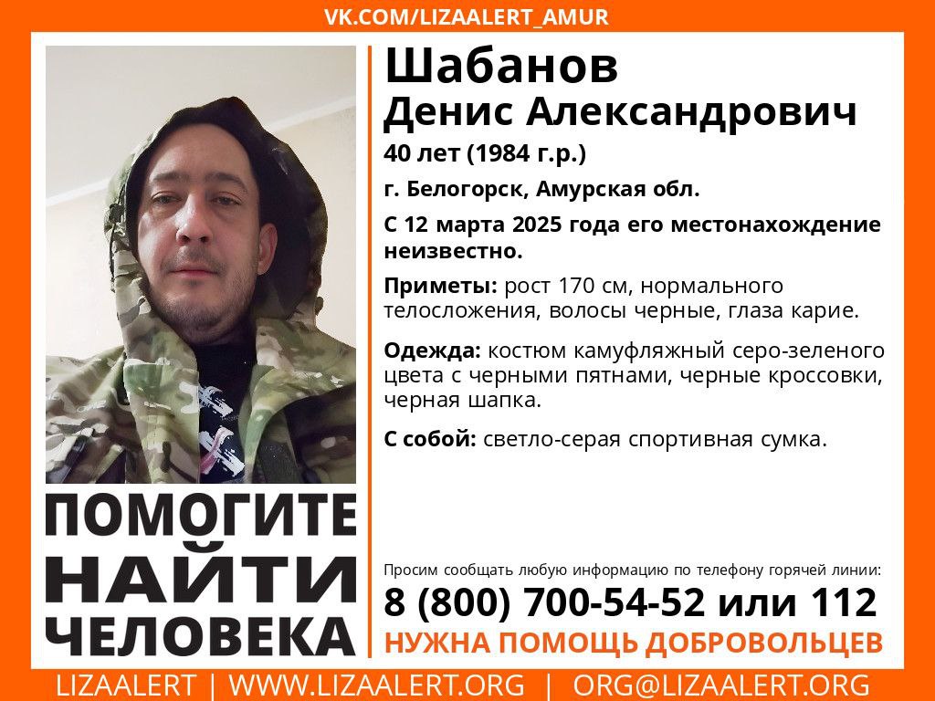 В Белогорске ищут 40-летнего Дениса Александровича Шабанова. Амурчанин пропал 12 марта. О поисках мужчины сообщил добровольческий поисково-спасательный отряд «ЛизаАлерт».