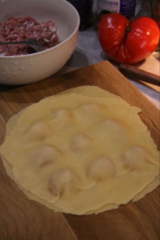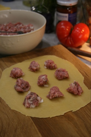 Снова возвращаемся к тесту. Делим колобок на 4 равных части. Одну часть раскатываем максимально тонко, толщиной примерно 1 миллиметр. Чайной ложкой набираем фарш и выкладываем ровными рядами на лист раскатанного теста. Затем раскатываем второй лист теста, накрываем им первый, с фаршем. Осторожно ребром ладони нужно пройтись между рядами, придавив немного тесто.