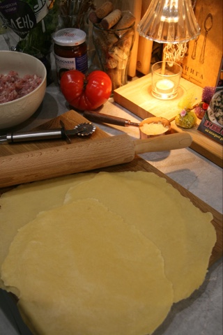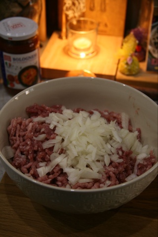 Пока тесто «отдыхает», можно заняться фаршем. Если готового нет, то перекручиваем мясо через мясорубку, добавляем мелко порезанный лук, соль, специи, пару столовых ложек воды для сочности. Фарш хорошо перемешиваем руками.
