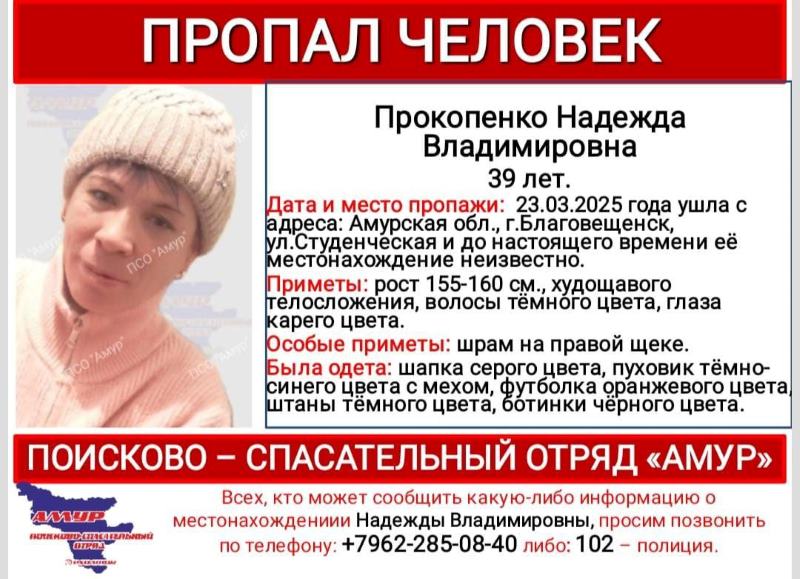 По информации поисковиков, рост ушедшей из дома на улице Студенческой амурчанки – 155-160 сантиметров. Надежда достаточно стройная, у неё тёмные волосы и карие глаза. Как особая примета указан шрам на правой щеке.