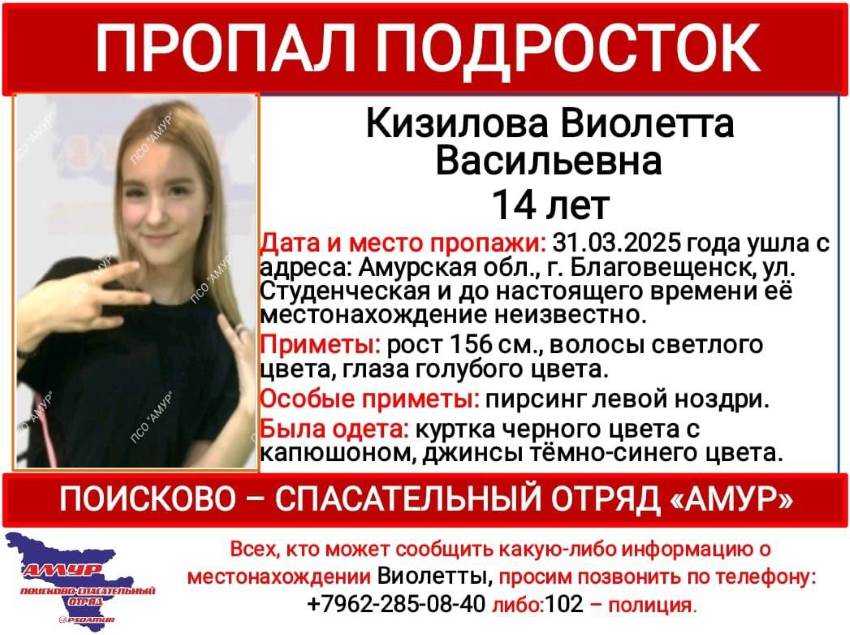 В ПСО «Амур» сообщили, что пропавшая 31 марта Виолетта Кизилова найдена, жива.