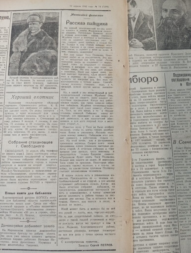 В рамках рубрики «Это было в 45-м» редакция Амур.инфо продолжает листать старые выпуски амурских газет и находить там яркие и порой забавные сюжеты из жизни Приамурья за месяц до Великой Победы. Сегодня – фельетон «Рассказ пайщика», опубликованный 15 апреля 1945 года в «Амурской правде». Автор – некто Сергей Петров, а герой – обычный пайщик из села Марково Благовещенского района, которому надоело терпеть странные порядки в местном магазине.