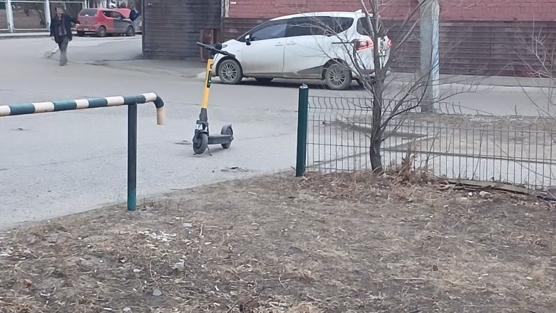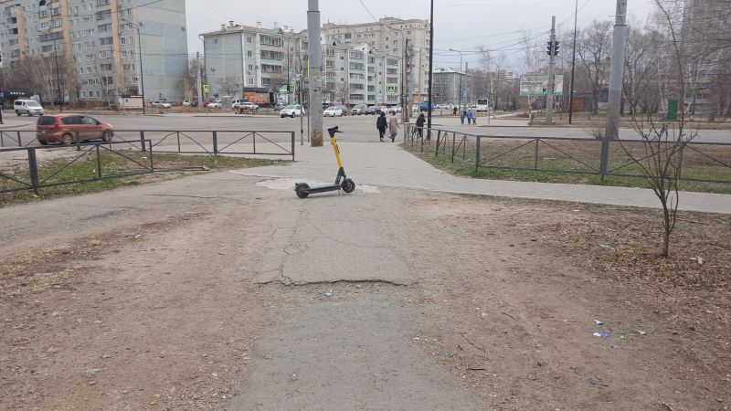 Утром в пятницу, 18 апреля, наша читательница Евгения пожаловалась на самокат, неудачно припаркованный посреди тротуара на пересечении улиц Студенческой и Институтской.