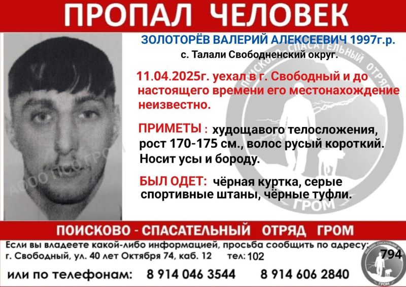 Золоторёв Валерий Алексеевич, 1997 года рождения, 11 апреля 2025 года уехал из села Талали в город Свободный. С тех пор его местонахождение остаётся неизвестным. О поисках мужчины рассказали в ПСО «Гром».