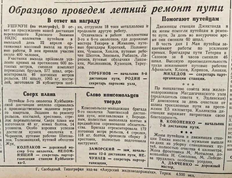 28 апреля 1945 года в газете вышла статья о работе путейцев. Трудились амурские путейцы на совесть, не покладая рук. Работники 8-й дистанции пути в посёлке Ушумун Магдагачинского округа даже присуждение Красного Знамени НКПС решили отметить нестандартным способом – они дружно вышли на путевые работы в свой выходной день 22 апреля.