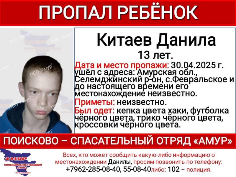 В ПСО «Амур» просят помощи в поиске 13-летнего Данилы Китаева. О местонахождении подростка ничего не известно с 30 апреля.