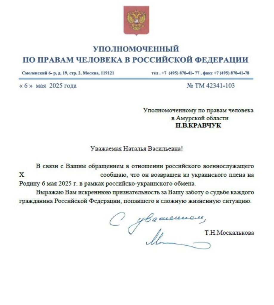 Вечером в минувший вторник, 6 мая, уполномоченный по правам человека в Приамурье Наталья Кравчук получила от федерального омбудсмена Татьяны Москальковой радостное известие. В рамках российско-украинского обмена военнопленными на родину вернулся житель Амурской области. Ранее супруга мужчины ради этого обратилась к Наталье Кравчук за помощью. В общей сложности амурчанин провёл в плену 1 год и 7 месяцев.
