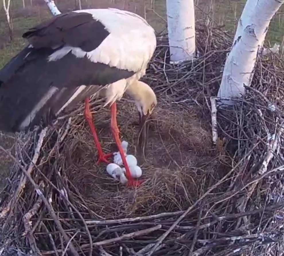 Уже на следующий день, 11 мая, вылупился второй малыш-аист. По словам Антона Сасина, сегодня птенцы должны будут отведать первую еду, принесённую родителями.