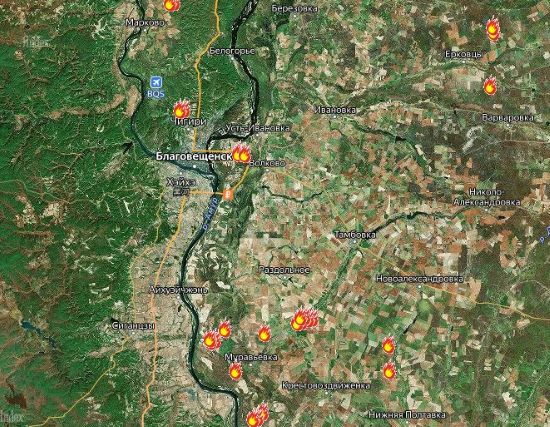 Между тем, по данным научно-исследовательского института «Аэрокосмос», областной центр Амурской области находится в кольце из пожаров. Возгорания зафиксированы в районе Чигирей, Волкова, Маркова Благовещенского округа, а также сёл Муравьёвка и Крестовоздвиженка Тамбовского округа.