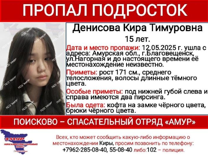 15-летняя Кира Тимуровна Денисова ушла с улицы Нагорной в Благовещенске 12 мая 2025 года. С тех пор о девушке не было вестей. Амурские поисковики сообщили, что у подростка длинные тёмные волосы, Кира среднего телосложения, ростом 171 сантиметр. Известны и особые приметы: под нижней губой у юной амурчанки слева и справа есть пирсинг. В момент пропажи Кира Денисова была одета в чёрные брюки и чёрную кофту на замке.
