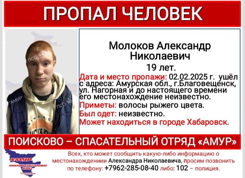 Первый пропавший амурчанин, чьи поиски ведутся более трёх месяцев, – 19-летний благовещенец Александр Молоков. 2 февраля он ушёл с улицы Нагорной и не вернулся. Где он сейчас – неизвестно, однако поисковики уточнили, что житель Приамурья может находиться в Хабаровске.