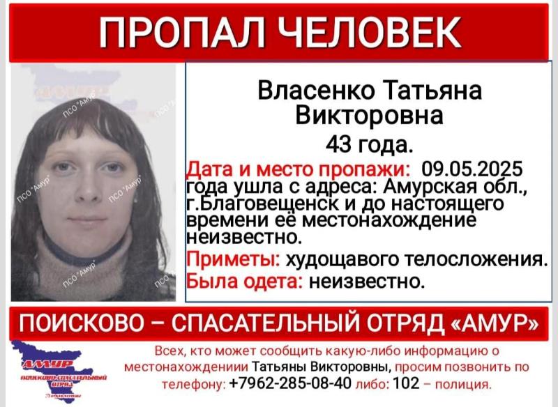 Также с начала месяца ведутся поиски 43-летней Татьяны Власенко. В последний раз её видели 9 мая в областной столице. Нынешнее местоположение женщины остаётся неизвестным.