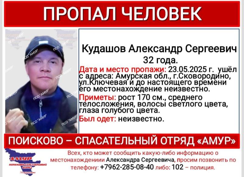 В пятницу, 23 мая, в Сковородине пропал 32-летний Александр Кудашов. Мужчина ушёл с улицы Ключевой и не вернулся домой.