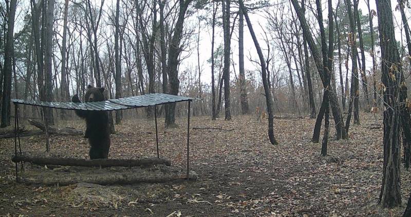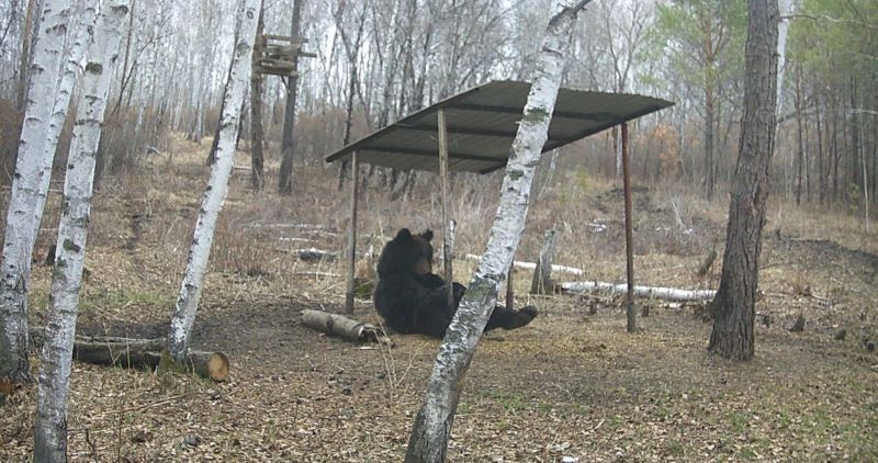 Установленная фотоловушка запечатлела весь процесс обеда косолапого. Медведь, вволю подкрепившись, видимо, устал и немного вздремнул на импровизированном столе, не желая покидать уютное местечко.