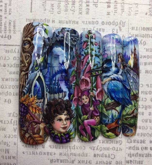 — Процесс создания рисунка на ногтях и на бумаге, конечно, разный – уже хотя бы потому, что бумага плоская, а ногти у нас имеют арки, ну и прочее, прочее, прочее… И отличия, безусловно, существенные, но здесь ведь дело не в сложности или простоте самих изображений. Здесь вопрос в том, что нужно уметь их уменьшить, в миниатюру перенести – вот в чём самый главный минус, самая главная сложность. А если говорить о тематике, то моё внутреннее состояние таково, что мне больше нравится рисовать что-то сказочное, фантазийное. Это эльфы, это какие-то драконы, что-то такое необычное, а конечно, не натюрморты, не какие-то довольно простые вещи. Нечто волшебное.