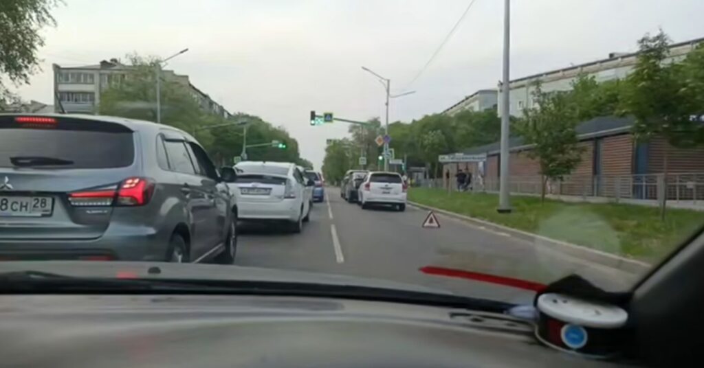 30 мая 2025 года в областном центре на пересечении улиц Калинина и Забурхановской свидетели запечатлели три застывших друг за другом перед светофором автомобиля. Три иностранных авто слегка впечатались друг в друга, судя по всему, не соблюдя дистанцию.