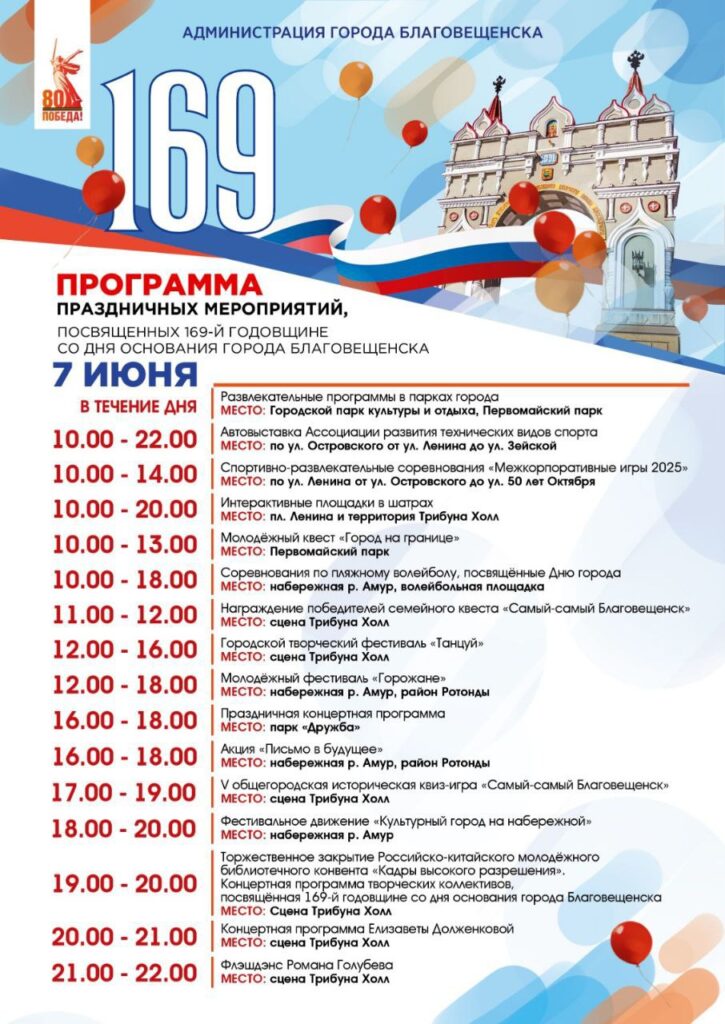 Основные мероприятия пройдут в городских парках, на площади Ленина, набережной Амура и в районе Трибуны Холл. Жителей и гостей Благовещенска ждут выставки, фестивали, квесты, интерактивные площадки и квизы. Всё это – под открытым небом и в атмосфере настоящего праздника.
