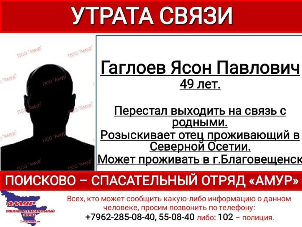 Ясона Павловича Гаглоева, которому 49 лет, ищет отец. Мужчина проживает в Северной Осетии. По его словам, сын не выходит с ним на связь. Ясон может находиться в Благовещенске, о его приметах волонтёры не сообщили.