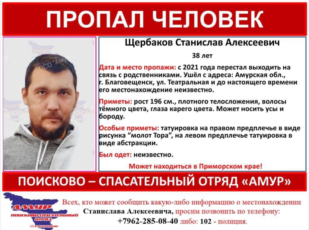 В областном центре ищут 38-летнего Станислава Алексеевича Щербакова. Он перестал выходить на связь с родственниками ещё в 2021 году. Известно, что тогда он ушёл с адреса на улице Театральной.