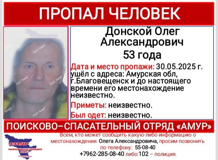 С 30 мая в Благовещенске не могут найти и 53-летнего Олега Александровича Донского. Приметы и во что был одет мужчина, поисковики не рассказали.