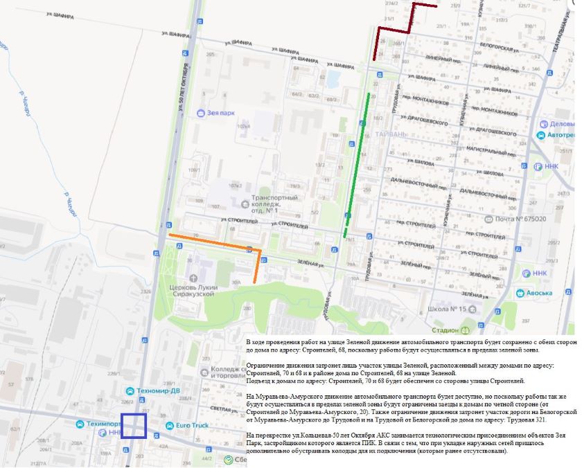 В пресс-службе мэрии амурской столицы предоставили карту участков, где на Тайване идут ремонтные работы. Как ранее уже сообщали в городской администрации, движение ограничено на участке улицы Зелёной, расположенном между домами на улице Строителей, 70 и 68, и в районе дома на улице Строителей, 68, на улице Зелёной.