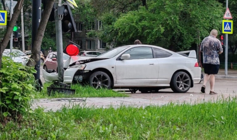 В пятницу, 13 июня, в Благовещенске иномарка протаранила светофор. Кадры с места происшествия опубликовали в телеграм-канале dpskontrol_28rus.