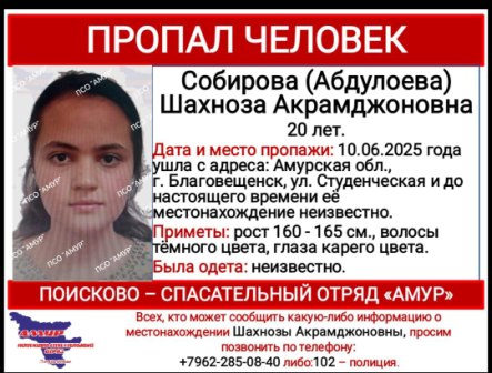 Волонтёры поисково-спасательного отряда «Амур» продолжают искать в Благовещенске 20-летнюю Сабирову (Абдуллоеву) Шахнозу Акрамджоновну, о которой ничего не известно с 10 июня.