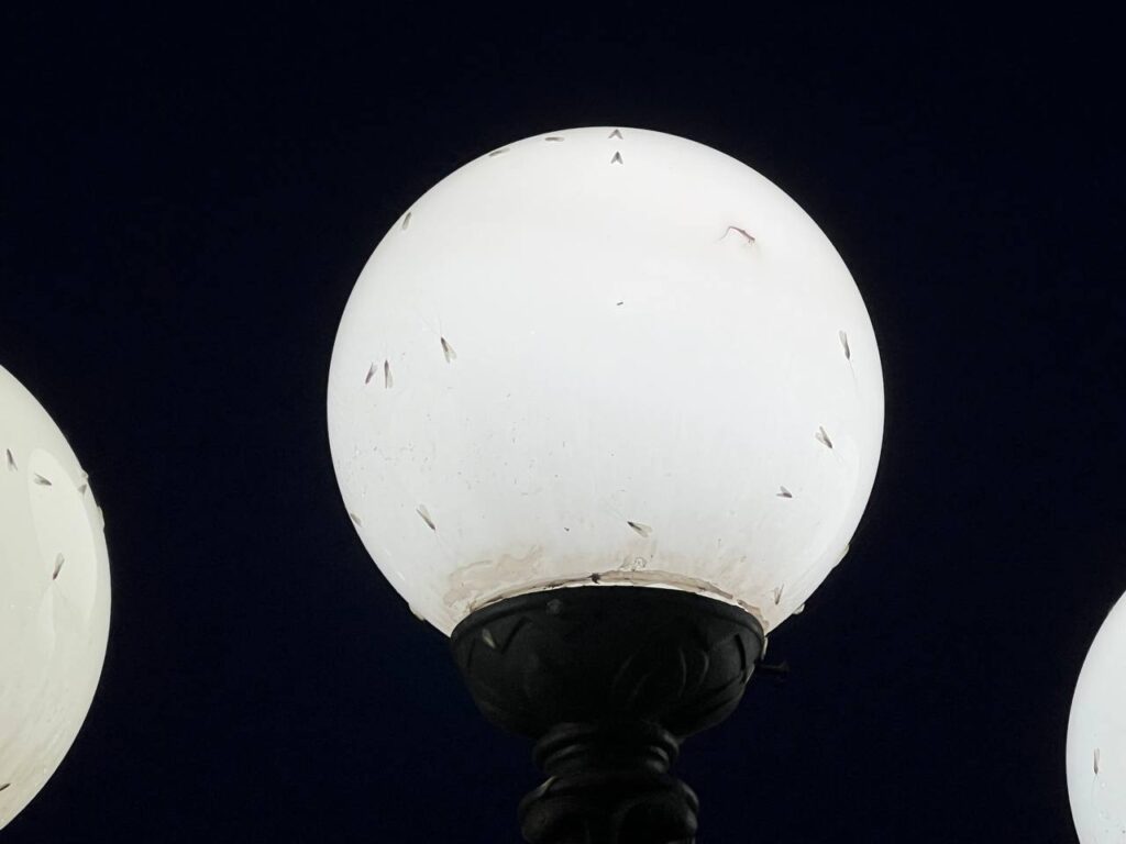 Тысячи кишащих в небе над набережной насекомых разглядеть на видео, снятых Александрой, не составляет никакого труда.